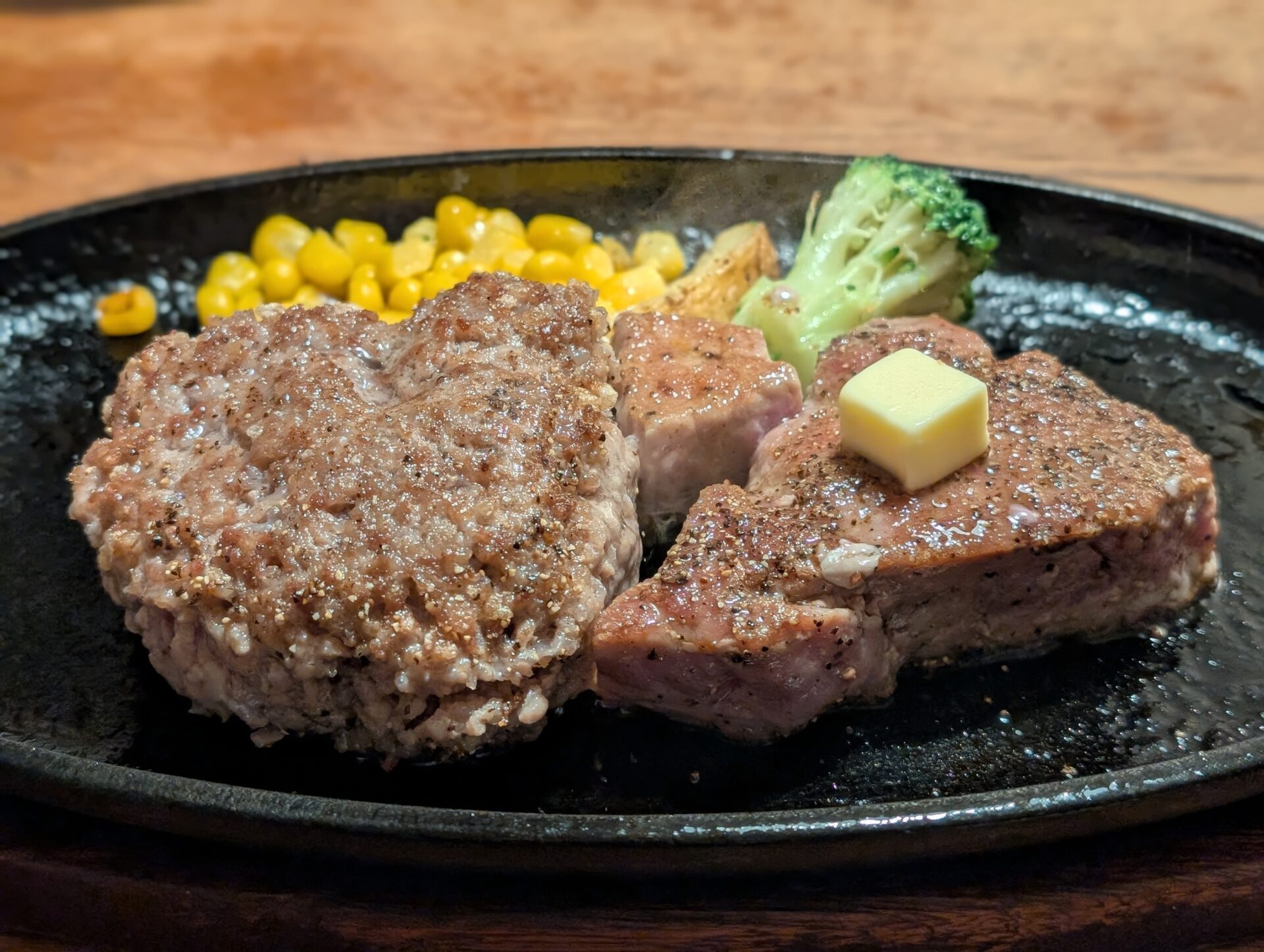 お値段からもお腹の空き具合からも、ザ・アメリカンビーフ!のようなサイズを期待していたのですが、そこまでのボリュームはなく⋯ただ、オニオンソースをかけて食べるとハンバーグもステーキも、とても美味しかったです。