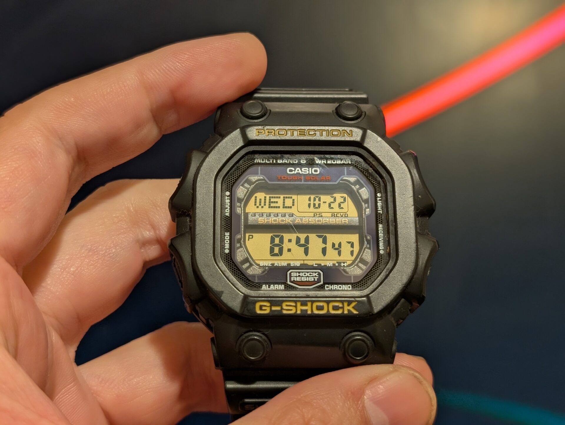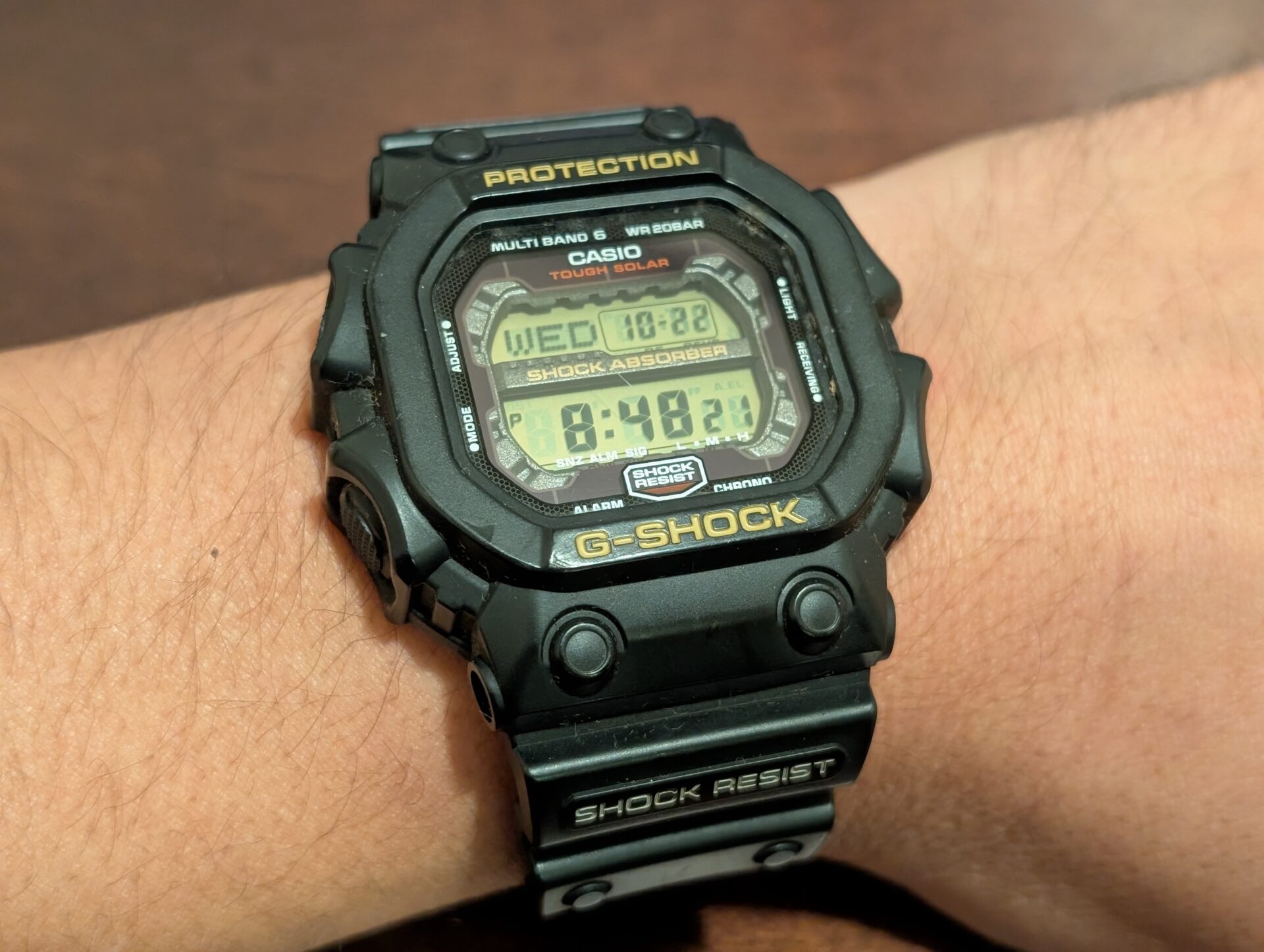 このG-SHOCK、歴代最大サイズなんですよ。型番はGXW-56で、「キング・オブ・Gショック」とも呼ばれる最大サイズモデルです。手首に装着すると、その大きさがお分かりいただけるでしょうか。