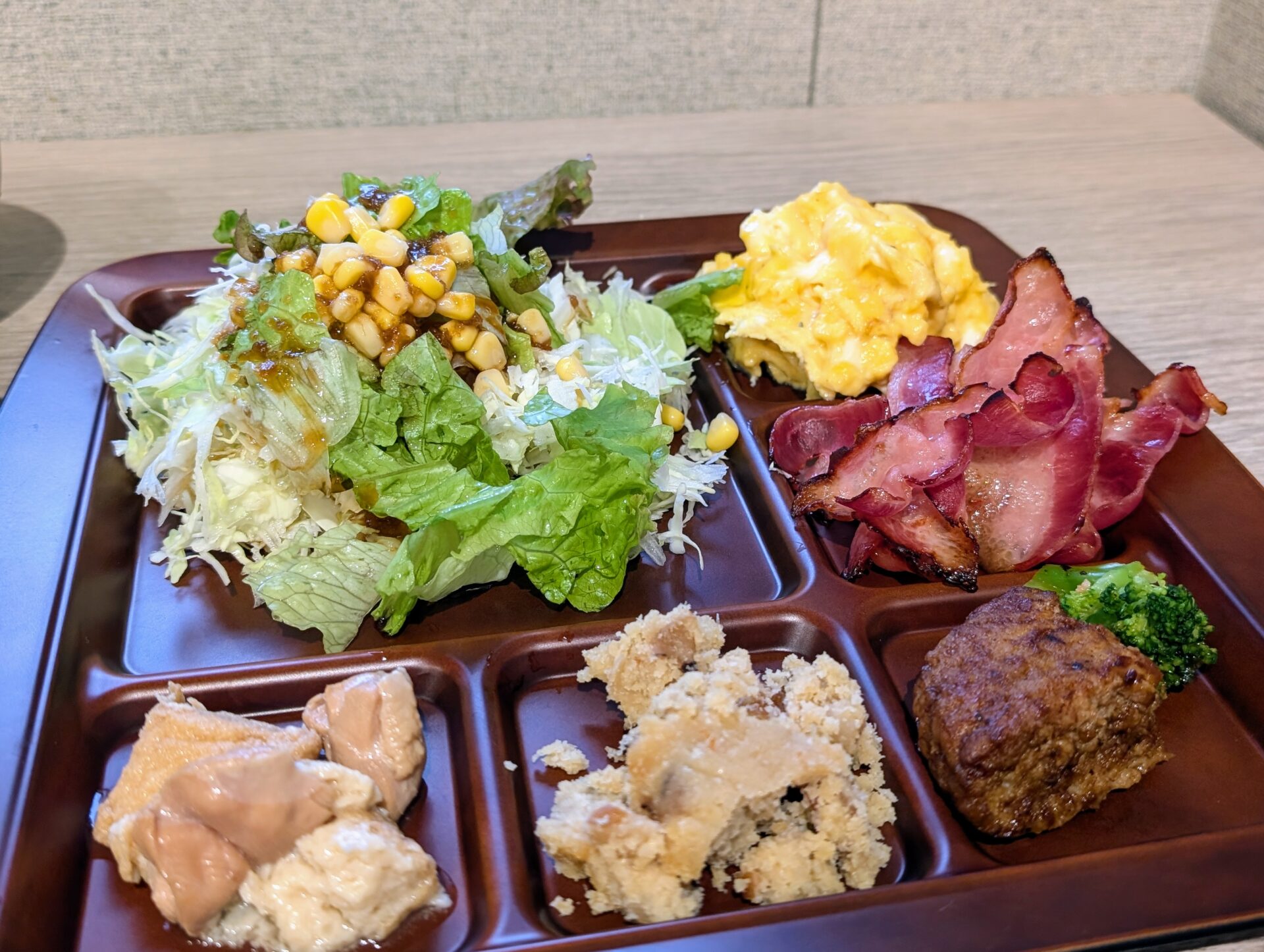 この日は朝からの雨予報です。が、そんな心配なんて何処吹く風です。宿泊したホテル(くれたけイン浜松駅前)の朝食バイキングに、あったんです。カリカリのベーコンと、ふわふわのスクランブルエッグが。ホテルの朝食バイキングといえは、この二品でしょうと言うくらいに大好きなんです。