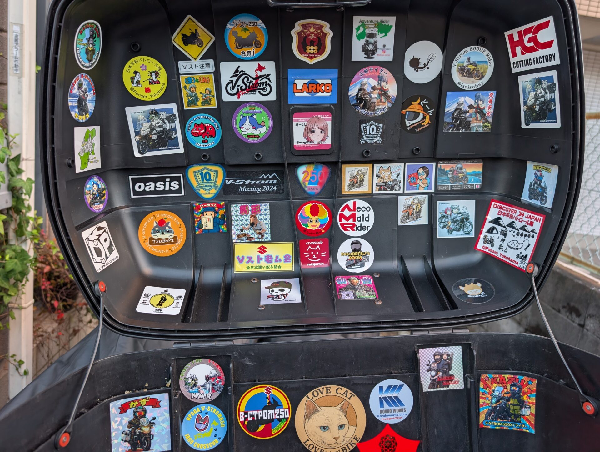 陽が落ちてしまう前に、いただいたステッカーをトップケースに貼り貼りしました。ミーティング後の儀式のようなものです。そして、必ずと言っていいほどやって来るミーティングロス。ステッカー貼りとロスは、セットみたいです。